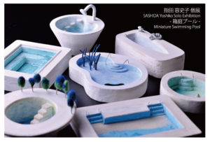 以前から、シーズンオフの水を抜いたプールの光景に目を囚われることが多かった。福島原発事故があった年の夏には、子どもたちが泳ぎたくても泳ぐことができないプールがテレビに映し出されていた。ミニチュアのプールを作りたいと思った。安全で守られたプールは、自然ぬのの脅威にふれることも他人の手によって破壊されることもない。気付くとそれは、心に問いかけ、作ることで自分の無意識の部分に触れる「箱庭」そのものだった。