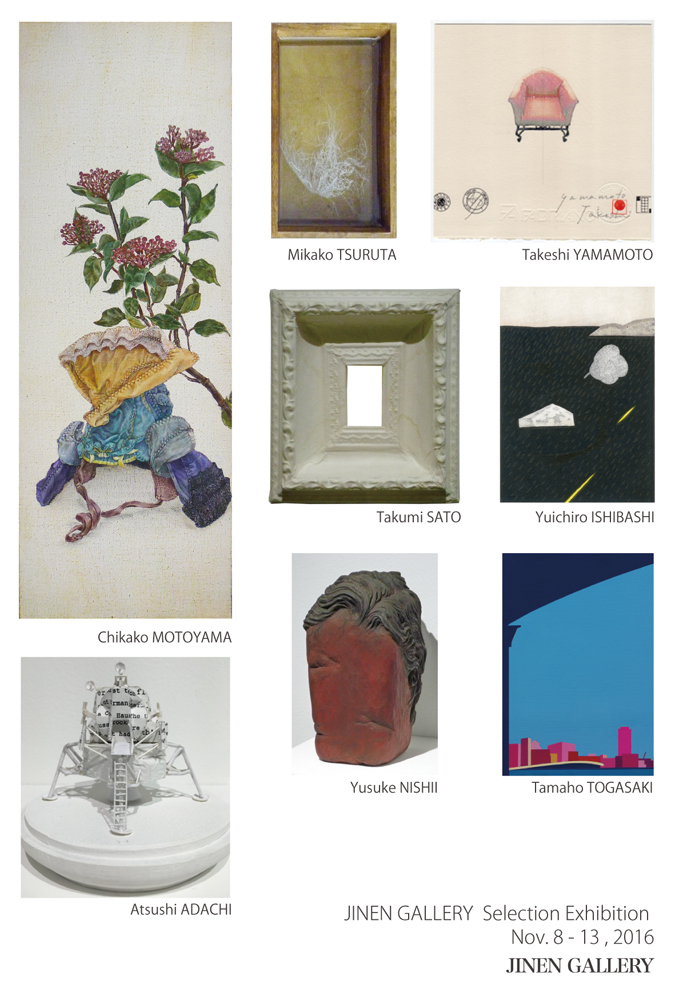 JINEN GALLERY selection展 2016年11月8日(火)〜11月13日(日)【B室】 【展示作家】 足立篤史 / 石橋佑一郞 / 佐藤琢巳 / 鶴田美香子 / 戸賀﨑珠穂 / 西井佑助 / 本山智香子 / 山本剛史